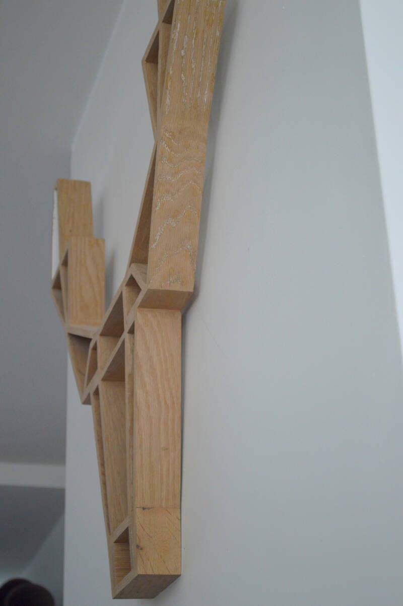 Een uit eikenhout vervaardigde hertenkop voor onze privewoning.